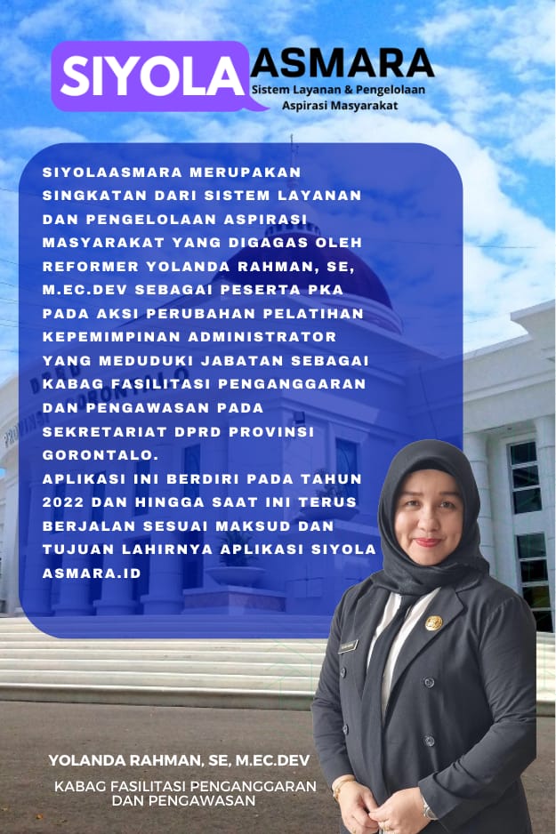 Sejarah Siyolaasmara silahkan Klik https://www.youtube.com/@siyolaasmara SiyolaAsmara merupakan singkatan dari Sistem Layanan dan Pengelolaan Aspirasi Masyarakat. Aplikasi ini dibuat sebab Sekretariat DPRD dalam melakukan pendataan dan pencatatan aspirasi hanya dalam bentuk manual pada secarik kertas Selanjutnya Tidak akuratnya data dan dokumen yang dihasilkan dari jaring aspirasi dilapangan, Sekretariat DPRD sering menjadi limpahan kesalahan atas adannya aspirasi yang tercecer. Sulitny.